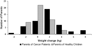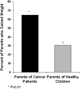 Parents of cancer patients were more likely to gain weight, and experienced significantly greater weight gain over the 3 months than parents of healthy children. The magnitude of weight gain was related to the degree of psychological distress that the parents experienced. Parents of cancer patients reported lower levels of physical activity and lower caloric intake than parents of healthy children, with the most marked differences between groups occurring in the area of physical activity.