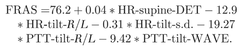 The method we propose differs from methods applied in other studies in that we utilized a short tilt phase, recorded the PTT, and processed the obtained measurements with the aid of Euclidean and non-Euclidean mathematics. Each mathematical method supplied a different dimension for the analysis of the data series: among five independent predictors of the FRAS, three were fractal dimensions, one belonged to recurrence quantification, and another to standard statistics.