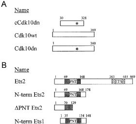 Cdk10 is a Cdc2-related kinase that may play a role in regulating the G2/M phase of the cell cycle. However little is known about the proteins that interact with this putative kinase and contribute to its function in the cell. We report in this study that Cdk10 interacts with the N-terminus of the Ets2 transcription factor, which contains the highly conserved Pointed domain and transactivation domain. The Pointed domain has been implicated in protein–protein interactions and we find that Ets2 requires an intact Pointed domain to bind Cdk10. The Pointed domain of Ets1 is highly similar to Ets2, however Cdk10 does not recognize Ets1 in a two-hybrid assay thereby demonstrating significant binding specificity on the part of Cdk10. We find that Cdk10 binds full length Ets2 in vitro and in vivo and inhibits Ets2 transactivation in mammalian cells.