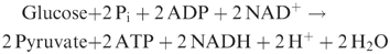 Glycolysis is a series of metabolic processes by which one molecule of glucose is catabolized to two molecules of pyruvate with a net gain of two ATP. The following equation shows the overall glycolytic reaction: