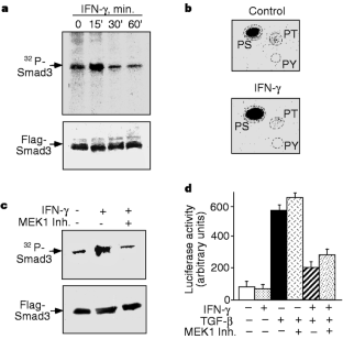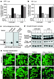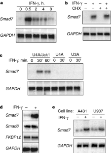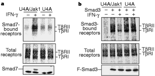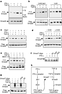 Transforming growth factor-β (TGF-β) and interferon-γ (IFN-γ) have opposite effects on diverse cellular functions1,2,3,4,5, but the basis for this antagonism is not known6. TGF-β signals through a receptor serine kinase that phosphorylates and activates the transcription factors Smads 2 and 3 (refs 7, 8), whereas the IFN-γ receptor and its associated protein tyrosine kinase Jak1 mediate phosphorylation and activation of the transcription factor Stat1 (refs 6, 9, 10). Here we present a basis for the integration of TGF-β and IFN-γ signals. IFN-γ inhibits the TGF β-induced phosphorylation of Smad3 and its attendant events, namely, the association of Smad3 with Smad4, the accumulation of Smad3 in the nucleus, and the activation of TGFβ-responsive genes. Acting through Jak1 and Stat1, IFN-γ induces the expression of Smad7, an antagonistic SMAD11,12, which prevents the interaction of Smad3 with the TGF-β receptor. The results indicate a mechanism of transmodulation between the STAT and SMAD signal-transduction pathways.