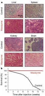 Chronic myelogenous leukaemia (CML) is a haematopoietic malignant disease associated with the expression of a chimaeric BCR–ABL gene1,2. We have designed an allosterically controllable ribozyme that specifically cleaves BCR–ABL messenger RNA and induces apoptosis in cultured CML cells3, and here we test it as a possible treatment of CML in a mouse model. We find that this ribozyme completely inhibits tumour-cell infiltration in these mice. To our knowledge, this is the first application of an artificial, allosterically controllable enzyme in animals, opening up the possibility of using ribozyme technology in the treatment of CML.