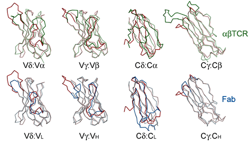 Comparison of the four domains of G115 with an αβTCR and an Fab. The Vδ, Vβ, Cδ, and Cβ domains of G115 (in red) are superimposed on to Vα, Vβ, Cα, Cβ TCR domains (top row, in green, 1qsf) and on to VL, VH, CL, CH Fab domains (bottom row, in blue, 8fab). Differences are highlighted (bold colors). Domains were aligned using 64 V- and 50 C-domain core residues (the Cδ:Cα alignment used only 20 residues). The r.m.s. deviations (in Å) over Cα atoms for each domain-domain pair are: Vδ:Vα 0.8, Vβ:Vβ 1.1, Cδ:Cα 0.8, Cβ:Cβ 1.0 and Vδ:VL 0.7 (with VH, 0.8), Vβ:VH 0.8 (with VL, 0.8), Cδ:CL 1.0, Cβ:CH 0.9. Comparisons with other αβTCRs and Fabs are similar.