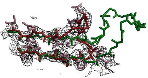 2Fo-Fc simulated annealing omit map for the FG loop of Cβ shows strong density for the entire loop and no density for the region occupied by the FG loop of Cβ. Backbone and side-chain atoms of Cβ are colored in red and pink, respectively; backbone atoms of a superimposed Cβ domain are shown in green. The map is contoured at 1.1δ with a cover radius of 2.3 Å.
