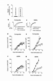 The amygdala plays a critical role in the mediation of emotional responses, particularly fear, in both humans and animals1,2,3,4. Fear conditioning, a conditioned learning paradigm, has served as a model for emotional learning in animals, and the neuroanatomical circuitry underlying the auditory fear-conditioning paradigm is well characterized5. Synaptic transmission in the medial geniculate nucleus (MGN) to lateral nucleus of the amygdala (LA) pathway, a key segment of the auditory fear conditioning circuit, is mediated largely through N-methyl-D-aspartate (NMDA) and non-NMDA (such as α-amino-3-hydroxy-5-methyl-4-isoxazolepropionic acid (AMPA)) glutamate receptors6; the potential for neural plasticity in this pathway is suggested by its capacity to support long-term potentiation (LTP)7,8. Here we report a long-lasting increase in the synaptic efficacy of the MGN–LA pathway attributable to fear-conditioning itself, rather than an electrically induced model of learning. Fear-conditioned animals show a presynaptic facilitation of AMPA-receptor-mediated transmission, directly measured in vitro with whole-cell recordings in lateral amygdala neurons. These findings represent one of the first in vitro measures of synaptic plasticity resulting from emotional learning by whole animals.