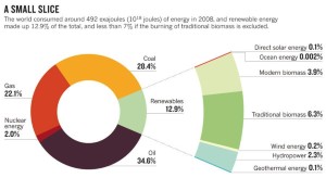Renewable energy sources, excluding the burning of traditional biomass such as wood, make up roughly 7% of global energy production (see 'A small slice'), and the working group's Summary for Policymakers estimates that by 2050, production could rise to between three and more than ten times its current level. No renewable technology is projected to dominate, but bioenergy, solar energy and wind will be important in the energy mix (see 'The big three').This shift towards renewable energy could reduce cumulative greenhouse-gas emissions by 220–560 gigatonnes of carbon dioxide, from a baseline estimate of 1,530 gigatonnes.