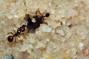 Daniel Goldman and his colleagues at the Georgia Institute of Technology in Atlanta studied fire ants (Solenopsis invicta; pictured) as they constructed tunnel networks in silica particles designed to mimic soil of varying moisture levels and particle size. Using X-ray imaging, the team found that up to a point, ants dug deeper tunnels through clay-like and fine-grained particles as the moisture content increased, using the growing stickiness of the particles. When digging, the ants either carried individual grains away if they were large, or gathered and compressed smaller particles into a pellet.