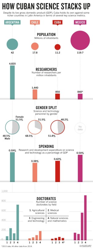 And they have had to scrape by with relatively little. In the past 6 years, Cuba has spent between 0.3% and 0.6% of its GDP on research and development annually — one of the highest rates in Latin America, but far less than Brazil (1.2%) and the United States (2.7%). And the government has yet to honour repeated promises to create a competitive grant-funding agency akin to the US National Science Foundation.