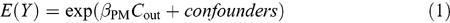 In this model, the expected value of the health endpoint (mortality count in this case) Y is modeled as an exponential function of the explanatory variables (the observed ambient particulate matter (PM) concentration, Cout, and other covariates). The relative risk (RR) associated with a change in the air pollution concentration is RR=exp[βPM×ΔCout], where the slope, βPM, is the log-relative risk of death associated with a unit change in measured ambient concentration. The risk model for PM is given by (U.S. EPA, 1996a,b):