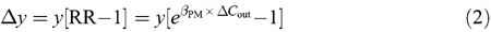 where the predicted excess mortality (Δy) is a function of the baseline health incidence rate (y), the change in the ambient PM air concentration (ΔCout) and the slope of the PM concentration–response curve (βPM). Implicit in Eqs. 1 and 2 is the assumption that the ambient concentration serves as an unbiased surrogate for total personal exposure. It is believed that this assumption is true when indoor-generated PM concentrations are statistically independent of outdoor-generated PM concentrations; then variations in PM health endpoints associated with the ambient component of personal exposures can be separately estimated (Wilson et al., 2000).