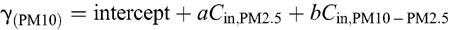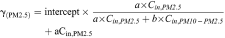 We estimate the value of γ(PM2.5) by assuming γ(PM2.5) is the fine fraction of γ(PM10). However, given the equation above, the partitioning of the intercept into two size fractions is unknown. Therefore, the following equation is used to estimate γ(PM2.5):