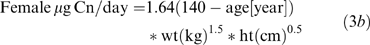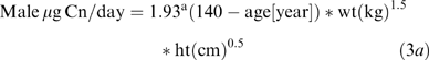 Owing to the large interindividual variation in Cn excretion, we chose to model this variability for each subject, instead of using the same mean values for all subjects. There are established norms for excretion of Cn on a daily basis, as a function of age, gender and body surface area (BSA). The BSA determines the daily heat loss that must be recovered through cellular metabolism that generates the Cn that is excreted by the urine. The BSA can be modeled as a function of a person's age, gender, height and weight. An expression for Cn production by “normal” males and females in the NHANES-III can be developed because there is an age, gender, height and weight recorded for each subject.