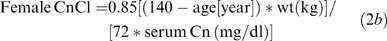For creatinine clearance (CnCl), ml plasma cleared/min/1.73 m2 BSA, the Cockcroft and Gault (1976) formula is