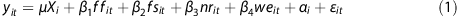 A pooled cross-sectional setup specifies the outcome yit as a function of an unobservable term that varies by participant αi, observable variables that vary by participant Xi, observable variables that vary within participants between the two dietary interviews ffit, fsit, nrit and weit, and an independently distributed unobservable disturbance term ɛit.