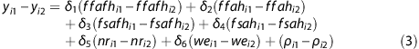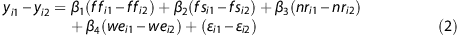 Owing to the presence of the unobservable term αi (for example, personal food and beverage preferences), estimating equation (1) by controlling for the observables Xi only is prone to omitted variable bias. The first-difference estimator eliminates the bias by taking the difference between the 2 days of data within each participant, so that αi and μXi that are common within participants are removed.