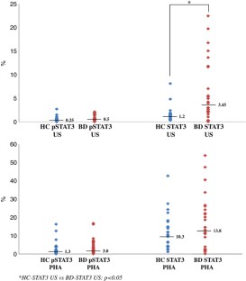 Th1/Th17-type T-cell responses are upregulated in Behcet’s disease (BD). However, signaling pathways associated with this aberrant immune response are not clarified. Whole-genome microarray profiling was performed with human U133 (Plus 2.0) chips using messenger RNA of isolated CD14+ monocytes and CD4+ T cells from peripheral blood mononucleated cell (PBMC) in patients with BD (n=9) and healthy controls (HCs) (n=9). Flow cytometric analysis of unstimulated (US) and stimulated (phytohaemagglutinin) signal transducer and activator of transcription (STAT3) and pSTAT3 expressions of PBMCs were also analyzed (BD and HC, both n=26). Janus family of kinase (JAK1) was observed to be upregulated in both CD14+ monocytes (1.95-fold) and CD4+ T lymphocytes (1.40-fold) of BD patients. Using canonical pathway enrichment analysis, JAK/STAT signaling was identified as activated in both CD14+ monocytes (P=9.55E−03) and in CD4+ lymphocytes (P=8.13E−04) in BD. Interferon signaling was also prominent among upregulated genes in CD14+ monocytes (P=5.62E−05). Glucocorticoid receptor signaling and interleukin (IL-6) signaling were among the most enriched pathways in differentially expressed genes in CD14+ monocytes (P=2.45E−09 and 1.00E−06, respectively). Basal US total STAT3 expression was significantly higher in BD (1.2 vs 3.45, P<0.05). The JAK1/STAT3 signaling pathway is activated in BD, possibly through the activation of Th1/Th17-type cytokines such as IL-2, interferon (IFN-γ), IL-6, IL-17 and IL-23.