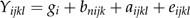 where Yijkl is the observation on the lth fish, gi is fixed effect of the ith genetic group, nijk is the number of fish in the kth tank of the jth family in the ith genetic group with b being a linear regression coefficient to correct for variations in the number of fish per tank, aijkl is the random effect of the lth fish in the kth tank and eijkl is the random residual term.