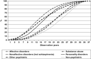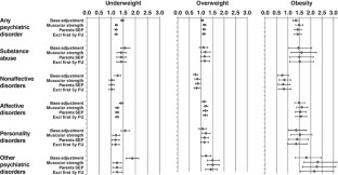 During 26 million person-years of follow-up, 19 684 men received DP due to psychiatric disorders. After adjustment, hazard ratios (HRs) due to any psychiatric disorder were 1.20 (95% CI: 1.15–1.26) for underweight, 1.14 (95% CI: 1.08–1.21) for overweight and 1.43 (95% CI: 1.28–1.60) for obesity compared to normal weight. For affective disorders, HRs were elevated for underweight (1.24, 95% CI: 1.16–1.32), overweight (1.19, 95% CI: 1.10–1.28) and obesity (1.55, 95% CI: 1.33–1.81), whereas for substance abuse increased risks were seen only for underweight (1.41, 95% CI: 1.23–1.61) and obesity (1.50, 95% CI: 1.07–2.12). For nonaffective disorders (including schizophrenia) overweight (HR=0.87, 95% CI: 0.76–1.00) and obesity (HR=0.79, 95% CI: 0.57–1.10) seemed to be protective, although not statistically significant. HRs for personality disorders were increased for underweight (1.18, 95% CI: 1.04–1.34), overweight (1.16, 95% CI: 1.00–1.30) and obesity (1.40, 95% CI: 1.03–1.90).