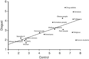 Disgust was the strongest predictor of negative attitudes toward obese people, and disgust fully mediated the association between perceptions of control and attitudes toward obese people. In addition, obese people were rated less favorably, and as more disgusting, than almost all social groups. Across all social groups, perceived control over group membership was positively correlated with disgust ratings, and disgust mediated the link between perceived control and favorability ratings.