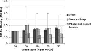 In 2000–2003 there was a counterintuitive association between greenspace and BMI. Residence in the greenest areas was significantly associated with increases in overweight (12%) and obesity (23%). In 2004–2007, there was a small protective effect of greenspace for those living in the greenest areas, but this was not statistically significant. Markers of total physical activity did not attenuate associations. Tests for interactions with urban/rural status confirmed that significant associations between neighbourhood greenspace and obesity were only present in urban areas in 2000–2003.