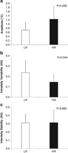 Lower weight loss was related with a more flattened pattern measured as amplitude from cosinor (r=0.235, P=0.032), a higher fragmentation of rhythms determined by higher intradaily variability (IV) (r=−0.339, P=0.002), and an impaired wrist temperature circadian rhythm determined by the means of Circadian Function Index (r=0.228, P=0.038). Further analyses showed that low responders displayed lower amplitude (0.71±0.36 versus 1.24±0.62, P=0.036) and higher fragmentation of the circadian rhythm (0.24±0.11 versus 0.15±0.07, P=0.043) than high responders. Whereas we did not find significant differences in total activity rates between high responders and low responders, we found significant differences for the mean values of body position for high responders (39.12±3.79°) as compared with low responder women (35.31±2.53°, P=0.01).