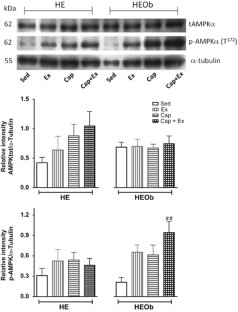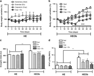 We investigated whether topical capsaicin, exercise or their combination had better therapeutic effects in an obesity-hypoestrogenism model. Ovariectomized Wistar rats were given a 30% sucrose solution (HE-Obese (HEOb)) or purified water (HE) during 28 weeks ad libitum; four experimental groups per each condition. After shaving the abdominal skin, cold cream vehicle was applied to the Sedentary groups (Sed) and capsaicin cream 0.075% (0.6 mg kg−1 per day) to the Capsaicin groups (Cap). Exercise (Ex) groups ran on a treadmill every day for 20 min at speeds from 9 to 18 m per min increased every 10 days; combination groups (Cap+Ex) were given topical capsaicin 90 min before exercise. The treatments were performed for 6 weeks, and caloric intake and body weight were monitored. At the end of the experimental protocol, glucose tolerance tests were performed, the animals were killed by decapitation; blood and organs were obtained to perform oxidative profile, histology, biochemical analyses and Western blot.