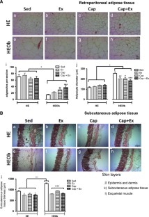 In HEOb rats, the combined therapy reduced caloric intake, body weight and abdominal fat in a higher proportion than the individual treatments; it also decreased insulin resistance (IR), oxidative stress and pancreatic islet size. It was the only treatment that significantly increased p-AMPK levels in the soleus muscle. In HE rats, topical capsaicin was the only treatment that reduced glucose intolerance and improved the oxidative profile in a higher proportion than the combined therapy or Ex alone.