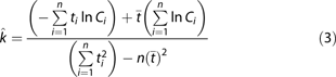 Suppose that a single serum measurement has been made for each of the n individuals, or that n serum measurements have been made for one individual. When no other covariates are included in a regression of log concentration versus time, the elimination rate constant k, (the negative slope) is estimated by: