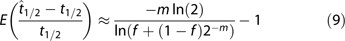 Approximate bias in log concentration regression half-life estimates in the presence of background exposures. Contours show the bias as a fraction of the true half-life, depending on the ratio of background initial to biomarker concentration (f) and the number of elapsed half-lives between the two time points (m).