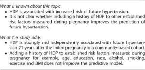Understanding the value of pregnancy as a ‘hypertension stress test’ is important for a number of reasons. First, if the development of hypertension in pregnancy provides better capacity to predict future hypertension over and above easily obtained clinical and demographic information, then this adds to the argument that we should implement careful follow-up and hypertension prevention and treatment strategies for these women. Second, in current clinical practice, very few women undergoing a risk assessment for future hypertension or CVD are asked about their pregnancy history.7 If HDP were shown to be strongly predictive of future hypertension even after taking other information into account, then there would be a strong argument for asking women about previous episodes of HDP at every clinical encounter. Alternatively, if clinical and demographic information easily obtainable from pregnant women is equally predictive of their risk of future hypertension, it may be more appropriate to counsel all young women with identifiable risk factors regarding lifestyle modification and blood pressure monitoring.