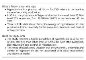 There are several possible reasons for the elevated prevalence of hypertension and lower awareness, treatment and control of the disease in Dehui city of Jilin Province of China compared with Korea, United States, Turkey and other areas of China. First, economic development and educational levels are lower in Jilin Province compared with these other regions. Medical organizations in China have generated less public awareness of the risks and burden to society of hypertension. Although the standard of living has improved in China, the new anti-hypertensive agents continue to be expensive and unaffordable for many people. Second, dietary salt intake is very high in Jilin Province. The Ministry of Health of China reported that people residing in the North-East of China have been shown to consume an average of 18–19 g day−1 of salt as compared with only 6–7 g day−1 in Guangdong, 8–9 g day−1 in Shanghai, and 14–15 g day−1 in Beijing. A Japanese study showed a dose–response relationship between diastolic BP and salt consumption,25 and as would be expected, we found a higher prevalence of hypertension in those who reported a high salt intake compared with those with a low salt intake (45.30% vs 28.50%, P<.001). The recommended daily consumption of salt for humans is 3–6 g day−1.26 Finally, Jilin Province has a longer winter season, which can prevent people from taking part in as much outdoor sports and physical activities as people in other regions.