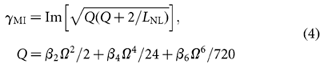 where Ω = (ω - ωo) and ωo is the pump frequency (if the coefficients in Table 1 are used, Ω is measured in units of 2π THz). By extending the perturbation analysis in ref. 7 and taking terms up to m = 6, it may be shown that the modulational instability (MI) gain per metre has the value: