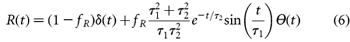 is the response function, which includes instantaneous electronic and delayed Raman contributions, the causality condition being taken into account through the Heaviside function Θ(t) (unity for t > 0 and zero for t < 0). The time t is in a reference frame moving at the group velocity (evaluated at ω = ω0) and is measured in the units of t0. The propagation distance z along the fibre is measured in units of LD2. N2 is the ratio between the peak power of the pump pulse and the peak power P0 = (γLD2)-1 necessary to create a single soliton in the ideal nonlinear Schrödinger equation (that is, equation (5), neglecting the Raman contribution and dispersion terms of order m > 2). For all the PCFs modelled, γ ≈ 0.002 m-1W-1. A is the amplitude of the electric field at the pump frequency, measured in the units of √(P0). The parameters of the response function were taken from ref. 7: fR = 0.18, τ1 = 12.2 fs/t0 and τ2 = 32 fs/t0.