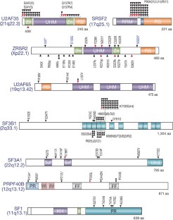 Myelodysplastic syndromes and related disorders (myelodysplasia) are a heterogeneous group of myeloid neoplasms showing deregulated blood cell production with evidence of myeloid dysplasia and a predisposition to acute myeloid leukaemia, whose pathogenesis is only incompletely understood. Here we report whole-exome sequencing of 29 myelodysplasia specimens, which unexpectedly revealed novel pathway mutations involving multiple components of the RNA splicing machinery, including U2AF35, ZRSR2, SRSF2 and SF3B1. In a large series analysis, these splicing pathway mutations were frequent (∼45 to ∼85%) in, and highly specific to, myeloid neoplasms showing features of myelodysplasia. Conspicuously, most of the mutations, which occurred in a mutually exclusive manner, affected genes involved in the 3′-splice site recognition during pre-mRNA processing, inducing abnormal RNA splicing and compromised haematopoiesis. Our results provide the first evidence indicating that genetic alterations of the major splicing components could be involved in human pathogenesis, also implicating a novel therapeutic possibility for myelodysplasia.