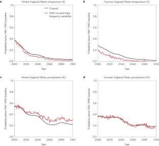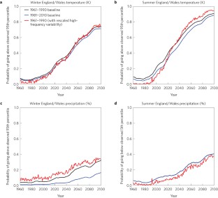 Our understanding of mankind’s influence on the climate is largely based on computer simulations1,2. Model output is typically averaged over several decades3 so that the anthropogenic climate change signal stands out from the largely unpredictable ‘noise’ of climate variability. Similar averaging periods (30-year) are used for regional climate projections4,5,6 to inform adaptation. According to two such projections, UKCIP02 (ref. 4) and UKCP09 (ref. 6), the UK will experience ‘hotter drier summers and warmer wetter winters’7,8 in the future. This message is about a typical rather than any individual future season, and these projections should not be compared directly to observed weather as this neglects the sizeable contribution from year-to-year climate variability. Therefore, despite the apparent contradiction with the messages, it is a fallacy to suggest the recent cold UK winters like 2009/2010 disprove human-made climate change9. Nevertheless, such claims understandably cause public confusion and doubt10. Here we include year-to-year variability to provide projections for individual seasons. This approach has two advantages. First, it allows fair comparisons with recent weather events, for instance showing that recent cold winters are within projected ranges. Second, it allows the projections to be expressed in terms of the extreme hot, cold, wet or dry seasons that impact society, providing a better idea of adaptation needs.