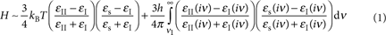where ϵI, ϵII and ϵs are the static dielectric constant of liquid I, II and the solid, respectively, ϵI(iν), ϵII(iν) and ϵs(iν) are the dielectric function of liquid I, II and the solid evaluated at an imaginary frequency iν, respectively, h is Plank's constant and ν1=2πkBT/h=2.88×1013 s−1 at 220 K. To estimate H, we need the dielectric functions of liquid I, II and the solid. Because it is difficult to obtain the dielectric function in the entire frequency range, we make the following two approximations: (i) The optical properties in a ultraviolet (UV) frequency range can be described as a single Lorentz oscillator: ϵ(iν)=1+[(n2−1)/(1+ν2+νe2)] (n: the refractive index of a material). (ii) The characteristic adsorption frequency in a UV frequency range, νe, of liquid I, II and the solid is the same. We note that νe values of liquid I and II are the same at least. Thus, the approximation is expected to be valid. We then obtain the following simple form of H35: