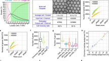 Jurkat cells were used in ddPCR assays to estimate conversion efficiency as follows: (1) the amount of RNA per Jurkat cell was determined by quantifying (Qubit, Invitrogen) RNA extracted (Maxwell RNA Purification Kits) from several different known number of Jurkat cells. (2) Bulk RT-ddPCR (Bio-Rad One-Step RT-ddPCR Advanced Kit for Probes 1864021) was performed on the extracted RNA to determine the copy number per cell of eight selected genes. (3) Approximately 5,000 Jurkat cells were processed using the GemCode Single-Cell 3′ platform, and single-stranded cDNA was collected after RT in GEMs following the protocols listed in the section ‘Sequencing library construction using the GemCode platform’. cDNA copies of the eight genes were determined using ddPCR (Bio-Rad ddPCR Supermix for Probes (no dUTP) P/N 1863024). The actual Jurkat cell count was found by sequencing a subset of the GEM-RT reactions on a MiSeq. The conversion efficiency is the ratio between cDNA copies per cell (step 3) and RNA copies per cell from bulk RT-ddPCR (step 2), assuming a 50% efficiency in RT-ddPCR34.
