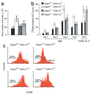 Caspases are important for apoptosis but are also involved in mammalian cell survival and cell division. Here we report that caspase-3 is a negative regulator of B cell cycling. Mice deficient in caspase-3 (Casp3−/− mice) have increased numbers of splenic B cells that show normal apoptosis but enhanced proliferation in vivo and hyperproliferation after mitogenic stimulation in vitro. Cdkn1a encodes p21 (also called Waf1 or Cip1), a cyclin-dependent kinase (CDK) inhibitor. Although expression of p21 was increased, CDK activities and proliferating cell nuclear antigen (PCNA) were increased in Casp3−/− B cells. Using Casp3−/−Cdkn1a−/− mice, we show that the hyperproliferation of Casp3−/− B cells is abolished when Cdkn1a is also deleted. Our genetic and biochemical data demonstrate that caspase-3 is essential in the regulation of B cell homeostasis.
