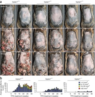 We thank H. Chang, T. Oro, P. Marinkovich, D. Felsher, S. Artandi, A. Sweet-Cordero, J. Ferrell, M. Diehn, A. Wong, Z. Siprashvili, J. Reuter, A. Ungewickell, D. Webster, K. Sarin, B. Sun, C. Lee, R. Flockhart, R. Spitale, K. Wang, S. Atwood and A. Barzel for critical comments and presubmission review; N. Phillips, F. Scholl, P. Dumesic, T. Ridky, K. Grimes and D. Mochley-Rosen for helpful discussions; A. Diep for review of histologic sections; S. Tao, L. Morcom, P. Bernstein and T. Doyle and the Stanford Small Animal Imaging Facility for administrative and technical support; A. Bernards (Harvard Medical School) for providing the Iqgap1 knockout mice; and G. Fisher for helpful advice and support. This work is supported by the US Department of Veterans Affairs Office of Research and Development and US National Institutes of Health grant R01 AR49737 (P.A.K.); the Lucile Packard Foundation for Children's Health and the Leukemia and Lymphoma Society (J.S.); and the National Institutes of Health under Ruth L. Kirschstein National Research Service Award 5T32 CA09302 and the SPARK Program at Stanford (K.L.J. and A.M.Z.).