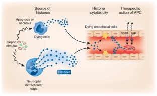 Injection of activated protein C (APC) is the last resort to rescue a patient with severe sepsis. Research into how APC works reveals that the drug inactivates histones (pages 1318–1321), which are toxic during severe sepsis.