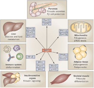 Sirtuin 1 (SIRT1), the mammalian homolog of SIR2, was originally identified as a NAD-dependent histone deacetylase, the activity of which is closely associated with lifespan under calorie restriction. Growing evidence suggests that SIRT1 regulates glucose or lipid metabolism through its deacetylase activity for over two dozen known substrates, and has a positive role in the metabolic pathway through its direct or indirect involvement in insulin signaling. SIRT1 stimulates a glucose-dependent insulin secretion from pancreatic β cells, and directly stimulates insulin signaling pathways in insulin-sensitive organs. Furthermore, SIRT1 regulates adiponectin secretion, inflammatory responses, gluconeogenesis, and levels of reactive oxygen species, which together contribute to the development of insulin resistance. Moreover, overexpression of SIRT1 and several SIRT1 activators has beneficial effects on glucose homeostasis and insulin sensitivity in obese mice models. These findings suggest that SIRT1 might be a new therapeutic target for the prevention of disease related to insulin resistance, such as metabolic syndrome and diabetes mellitus, although direct evidence from clinical studies in humans is needed to prove this possibility. In this Review, we discuss the potential role and therapeutic promise of SIRT1 in insulin resistance on the basis of the latest experimental studies.