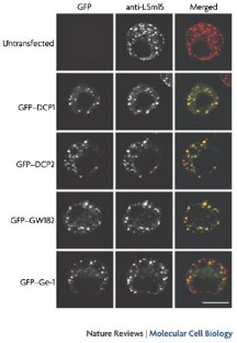 Fenger-Gron, M., Fillman, C., Norrild, B. & Lykke-Andersen, J. Multiple processing body factors and the ARE binding protein TTP activate mRNA decapping. Mol. Cell 20, 905–915 (2005). References 13 and 14 show that an uncharacterized human protein, called Ge-1, RCD-8 or Hedls, localizes to P bodies. Reference 14 shows that Hedls is part of a large protein complex that comprises the decapping enzyme DCP2 and the decapping co-activators DCP1, RCK/p54 and EDC3.