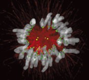 Khodjakov and colleagues made three-dimensional (3D) time-lapse movies of human cells undergoing mitosis and expressing green fluorescent protein (GFP) fused to proteins that localize to centrosomes and kinetochores. They observed that, during the initial stages of spindle formation, shortly after the nuclear envelope breaks down, chromosomes arrange into a ring around the spindle, with centromeres pointing inwards towards the spindle axis and arms pointing outwards. They also found that microtubules densely accumulate in the central part of the spindle and that centromeres are at the boundary of the spindle, with their kinetochores interacting with microtubules in a lateral manner. At later stages of spindle formation, chromosomes move to the central part of the spindle and form a typical metaphase plate, which precedes sister chromatid segregation in anaphase.