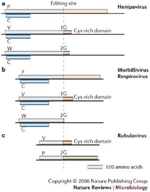 The paramyxovirus P gene encodes three transcripts: the P, V and W proteins, each of which has a unique C-terminal domain and, compared with morbilliviruses and rubulaviruses, an N-terminal extension of 100–200 amino acids. P-gene products allow henipaviruses to evade host antiviral defences by inhibiting both dsRNA signalling and interferon (IFN) signalling. Both the V and W proteins inhibit dsRNA signalling, but their distinct C-terminal domains enable them to do so in different cellular compartments; the W protein contains a nuclear-localization signal in the C-terminal domain. The P, V and W proteins also inhibit IFN signalling by targeting the STAT proteins in a novel strategy for paramyxoviruses that involves STATs being sequestered in high-molecular-weight complexes and, again, the W protein acts in the nucleus.
