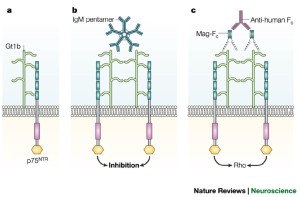 Three inhibitors of axonal regeneration have been identified in myelin – Nogo, myelin-associated glycoprotein (Mag) and oligodendrocyte myelin glycoprotein (Omgp). All of these proteins induce growth cone collapse and inhibit neurite outgrowth.