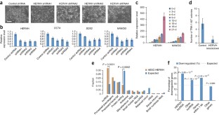 (a) Location of shRNAs against HERVH. (b) Expression of differentiation markers as determined by qPCR after HERVH depletion. Biological triplicate data (n=3 extracts) is presented as mean ±s.e.m. (c) Western blot of OCT4 and NANOG expression after HERVH knockdown. (d) Expression of pluripotency markers (OCT4, NANOG and SOX2) and differentiation markers (GATA6 and RUNX1) after scrambled shRNA knockdown. Biological triplicate data (n=3 extracts) is presented as mean ±s.e.m. (e) Expression of NANOG and SOX2 as determined by immunostaining after HERVH depletion. (f) Expression of pluripotency (SOX2, TRA-1-81 and NANOG) and differentiation marker (ACTA2) after HERVH depletion.