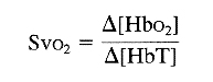 NIRS does not measure absolute concentrations of the chromophores, but it does measure changes in their concentrations, and the method described in this report makes use of that fact. Occlusion of venous drainage for a few seconds causes a rise in the measured concentration of both Hbo2/Mbo2 and Hb/Mb. It is reasonable to assume that the tissue myoglobin content will remain constant, and the oxygenation state of myoglobin will not be affected by a short venous occlusion lasting just 10 s. Changes from the baseline during venous occlusion should therefore be due solely to changes in Hbo2 and Hb. If all of the increase in the hemoglobin content of the tissues is due to an increase in the venous blood volume, then the Svo2 may be calculated from: Equation where [Hbo2] = change in concentration of Hbo2 and [HbT] = change in the total concentration of hemoglobin (Hbo2 + Hb).