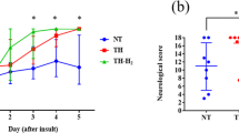 On postnatal day 7 (P7), pups were assigned randomly to SHAM or HI groups. Mice were anesthetized using 2% isoflurane inhalation. Surgical procedure was made at room temperature (25 °C) under binocular microscopy within 5 min. The right common carotid artery was isolated and cauterized by bipolar heating forceps. The mice were allowed to recover for 3 h. Mice were then exposed to 8% O2 for 45 min at 37–38 °C (temperature was measured with a thermometer placed in the chamber) in a tightly closed humidified chamber (controlled by Pro-OX sensor). Following hypoxia, pups recovered for 1 h in the same chamber maintained at 37–38 °C breathing room air. SHAM group animals underwent only surgery without carotid artery cauterization and then hypoxia for 45 min like the HI group.