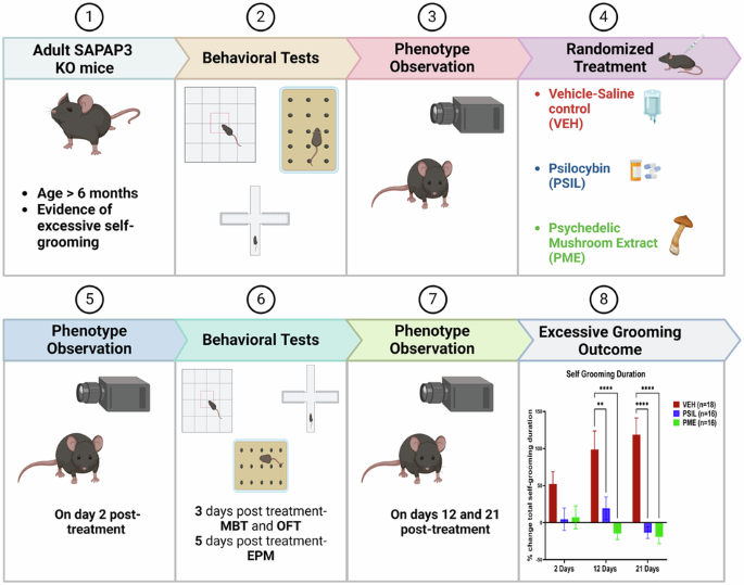 An interesting question raised by our findings is whether entourage molecules found in psilocybin-containing psychedelic mushroom extract might enhance the therapeutic effect of psilocybin in SAPAP3 KO mice. In a recent study in which we measured synaptic protein levels after synthetic psilocybin and psilocybin-containing mushroom extract administration, we found that the extract had a more potent and prolonged effect on synaptic plasticity than synthetic psilocybin. In the same study, our ex vivo brain metabolomics data supported a gradient of effects from inert vehicle via chemical psilocybin to PME, further supporting differential effects [35]. In the current study the effect of PME was more pronounced than that of PSIL in certain cases, such as alleviating head-body twitches after 21 days and excessive grooming after 42 days. In the case of excessive self-grooming after 42 days, it should be noted that these changes might be biased as only responders were included in this particular “long-term” analysis. In relieving anxiety-related phenotypes, there was an advantage of PME over PSIL in the OFT and EPM.