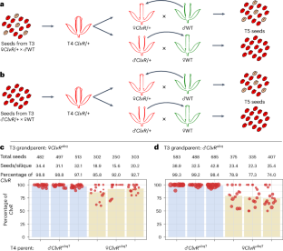 Extended Data Fig. 3 T3 heterozygous ClvR crosses for (a) female ClvRCaMV35S and (b) male ClvRCaMV35S.